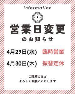 【太田店】4月29日(水)30日(木)営業日変更のお知らせ